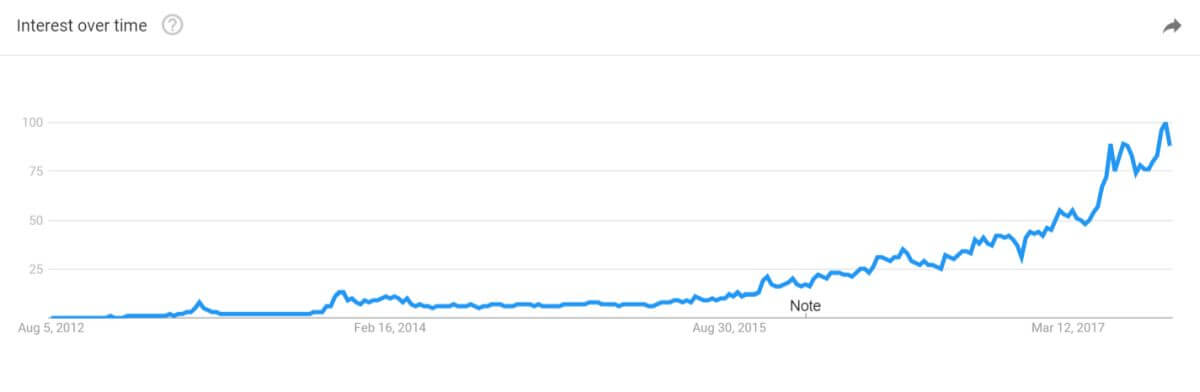 Blockchain popularity grows every day. A huge number of articles is already written about it. 1,703 discussions in Stackoverflow and thousands of questions on Quora contain the word “blockchain”. Here is how Google Trends show the dynamics of blockchain topic popularity.