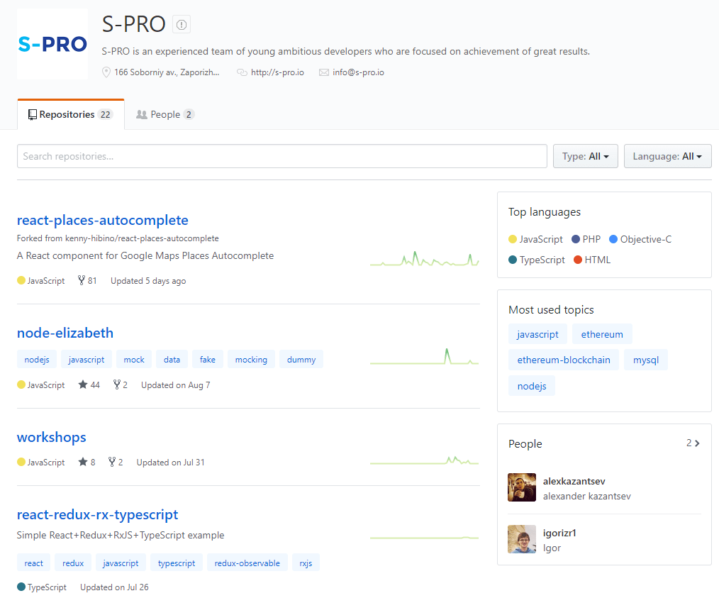 Github is a goldmine of information about talented developers. On the company’s profile, you can see the full contact information, including the owned repositories, top languages, and people who contribute to the company repository.