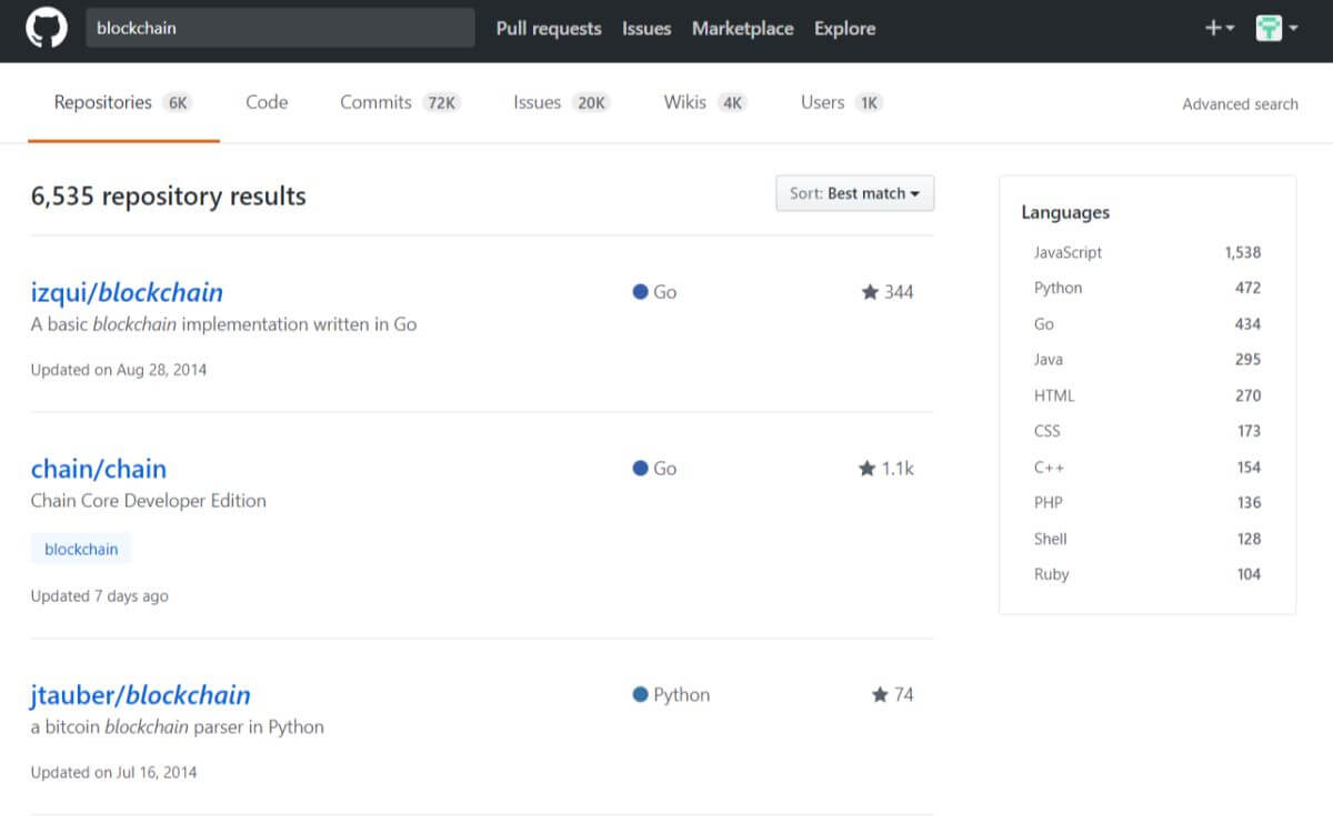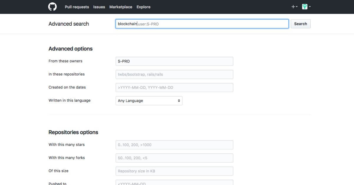 There is an advanced search with a lot of additional options. For example, you want to know whether a particular developer team has repositories with blockchain technology. Here is what you need to enter in search fields.