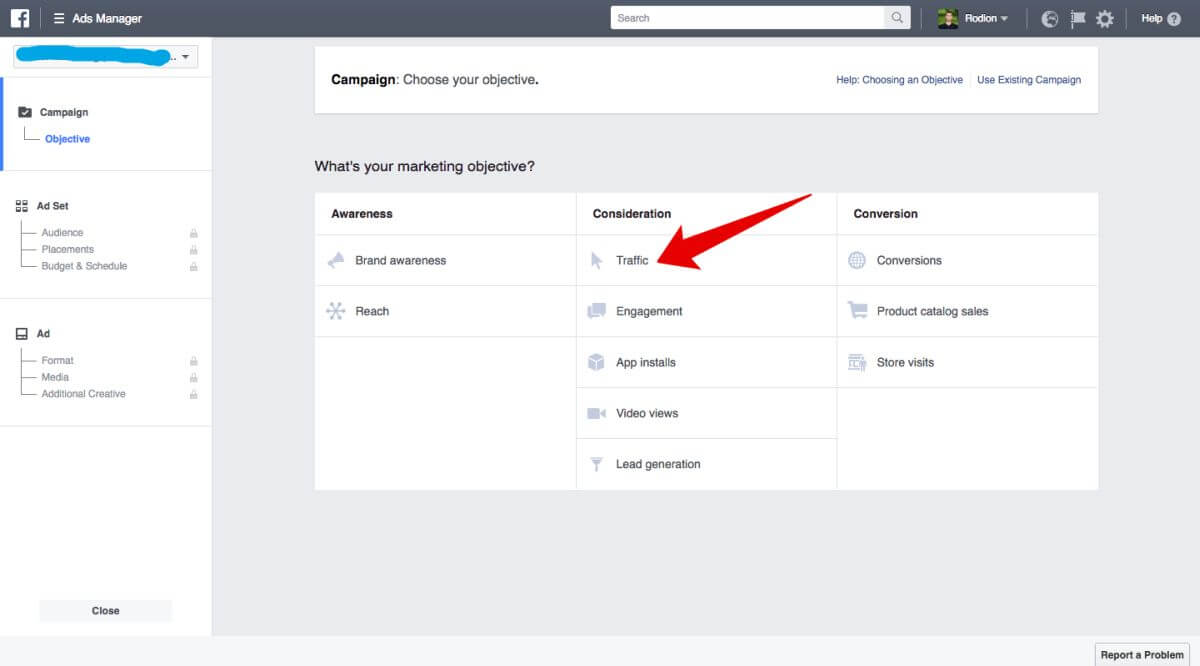 The system will send you to the first stage of the ad campaign creation. Here you should choose the goal “Traffic” and click “Continue.”