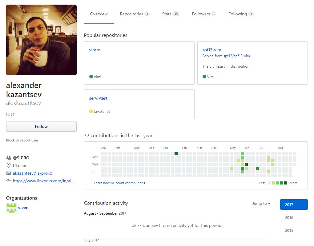 If you are on the individual professional’s profile, you can see contact information, a company where a developer works, contributions, and lots of other useful information.