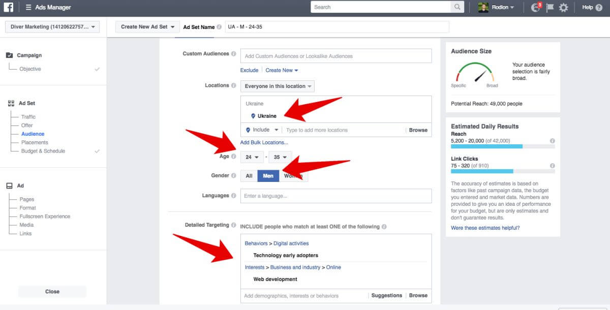 Setting up the audience. At this stage, you should indicate your potential developers’ location, gender and age, interests, and behavior. Let’s consider how to set up targeting to find Ukrainian developers, for example.