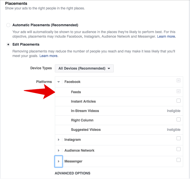 Placements. It’s advisable to select the Facebook news feed as the primary placement.
