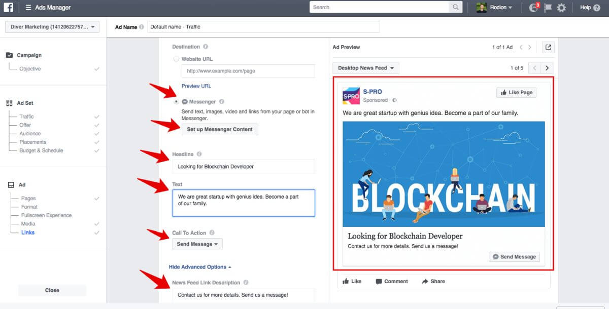 - Choose a link: it means that once people click on your ad, they will be directed to your website or messenger. We’ll choose a Messenger. This link will direct people right to a place where they can instantly message your company. For this kind of link, you can use a phrase in an ad copy like “I’m ready to work on your project, let’s discuss the details”;