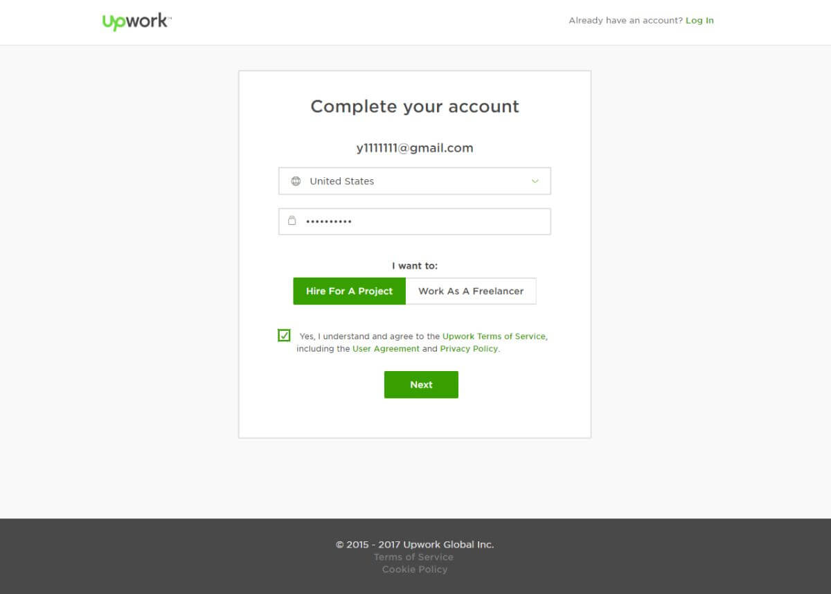If you already have an account, just log in. Make sure that you are registered as an employer. It is important as users can perform two roles on Upwork: an employee and employer. You should choose yours at the very beginning. Select your country, set up a password, and read the agreement on the Upwork policy.