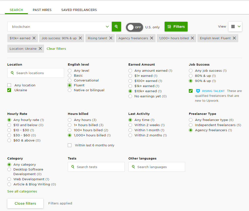 You can indicate some skills you’re looking for in developers. You will see an advanced search menu with search results. Here you can choose the location of developers, their English proficiency level, earnings on Upwork, job success, hourly rate, hours billed, the type of freelancer (independent one or an agency), etc.