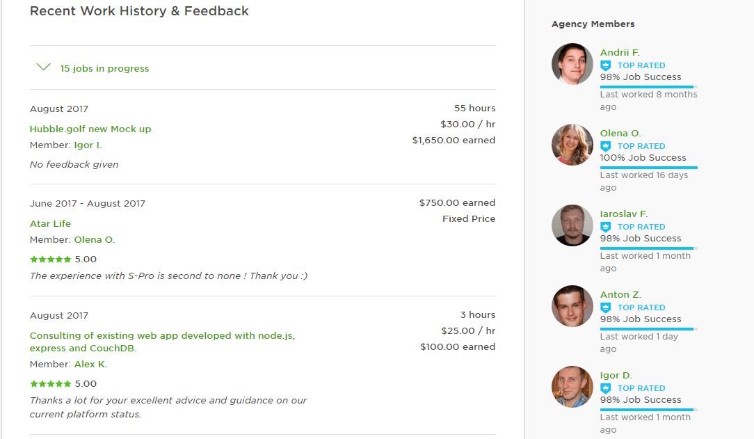 - Recent work on Upwork. Here you can see all the projects that developers had on Upwork and the related information. Also, you can see the client’s feedback.