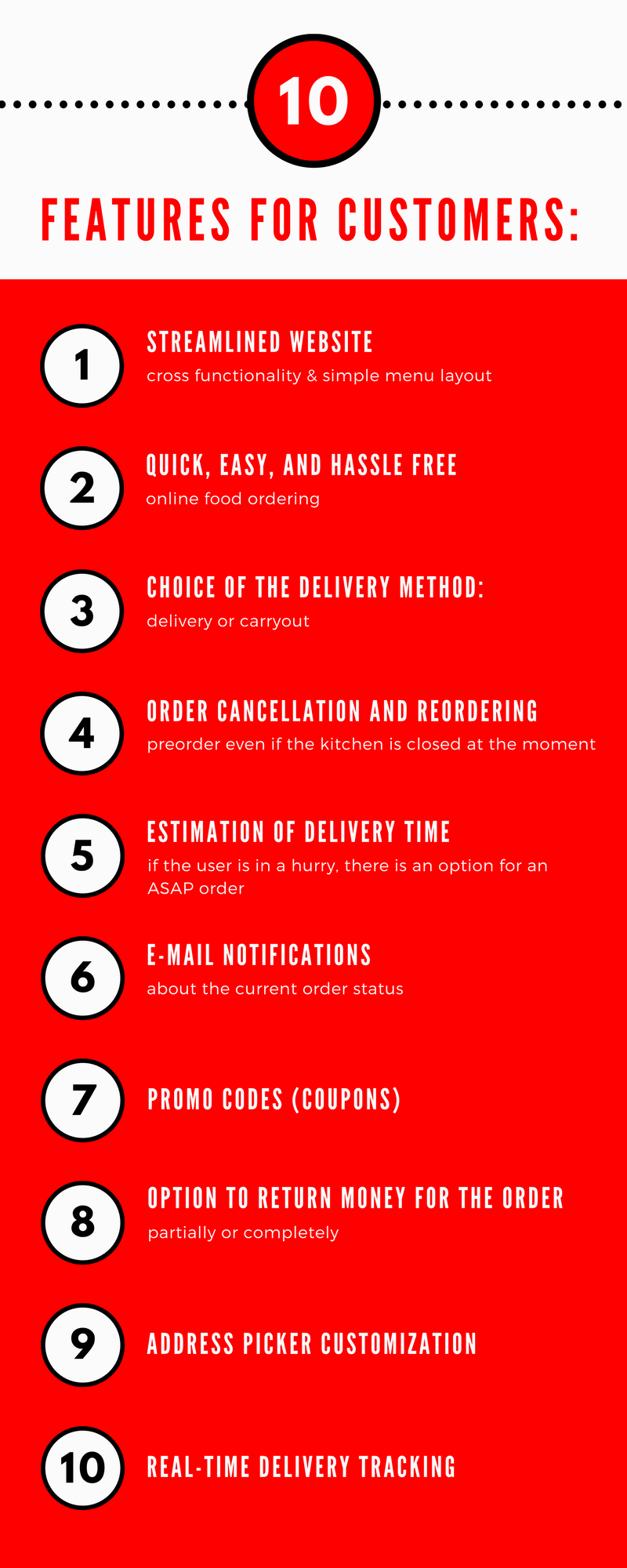 A good food tech platform requires the implementation of functions which meet the needs of customers, restaurant staff, and drivers. Thus, three groups of tech features should be developed to satisfy all parties:
