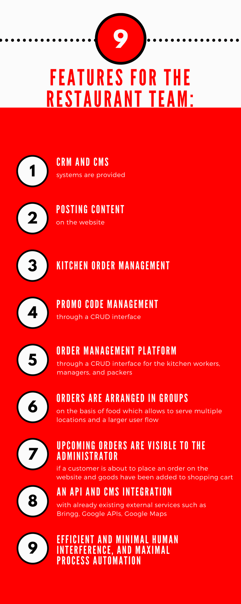 - The restaurant team should have ordered a management platform, CRM and CMS systems, minimal human interference, and maximal process automation.
