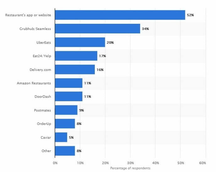 The transition of food tech business from offline to online is a worldwide trend. According to Statista, the most used restaurant delivery services in the US in 2017 were GrubHub/Seamless, UberEats, Eat24/Yelp, Delivery.com, Amazon Restaurants, DoorDash, Postmates, OrderUp, and Caviar.