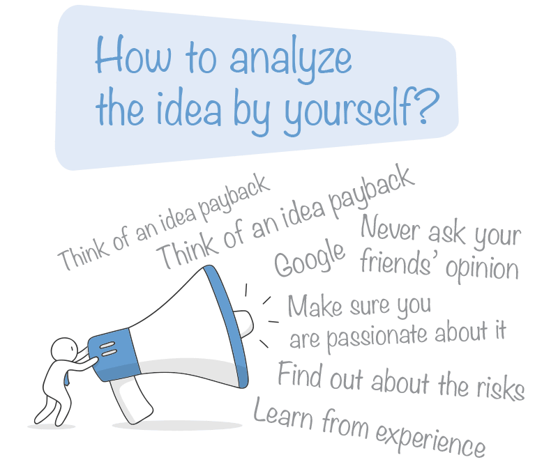 Think through the situations when the idea won’t work. What can you lose or receive? Can you handle it all? Ask yourself how much you are willing to risk. If you are not ready to risk your own money, most investors will tell you that you are not a businessman. If you are serious about your business and are confident in the idea, then you are confident in making decisions about investing money. But if you can’t bring yourself to invest in your own idea, how can you expect it from another person – most likely this idea is worthless. Feel free to proceed to the next idea and simply don’t waste time!