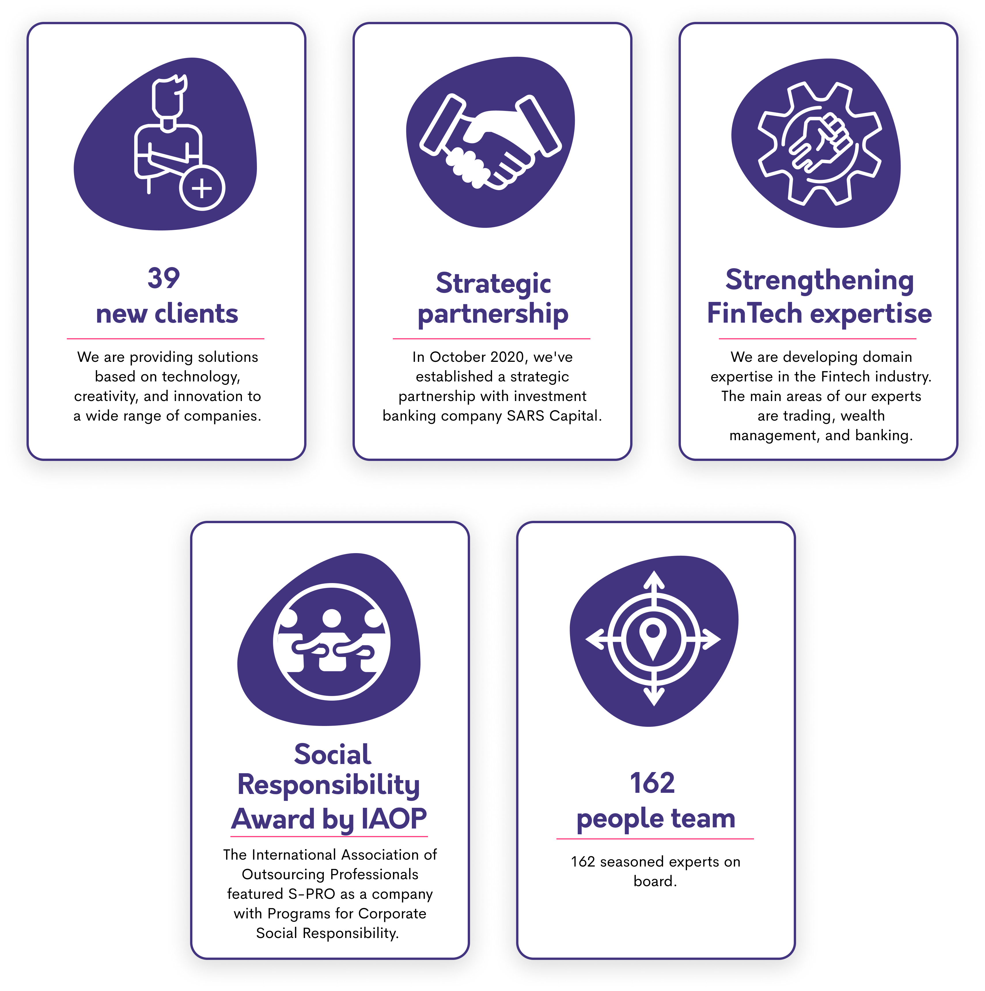 2020 has been a special year for the whole world. As we look back, we would like to share some great things that we achieved this year. We are proud to became a software development partner to 39 new clients in 2020. Now we provide digital innovative solutions to a wide range of companies around the globe. In October 2020, we established a strategic partnership with SARS Capital, an investment banking company. Over the past year, 82 new talented and passionate people have joined S-PRO.