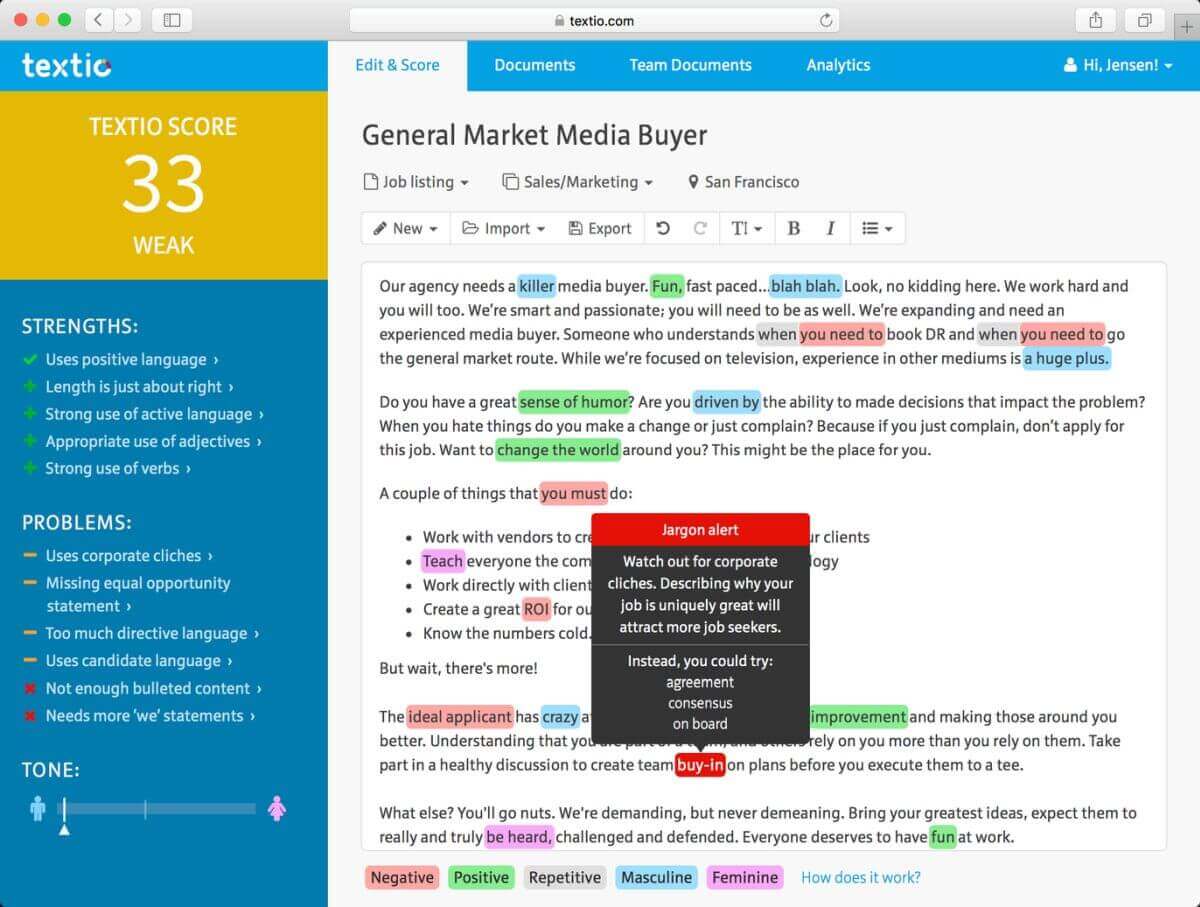 The first focus of Textio was job postings—to determine how well they will perform among candidates. They found that certain words and layouts attract more candidates than others.